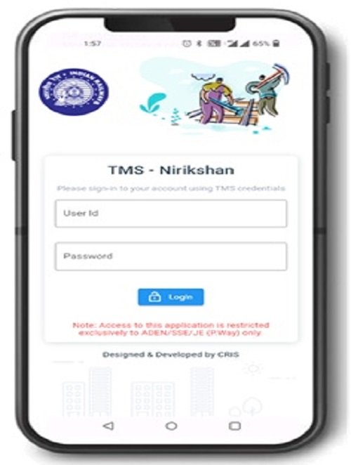 Mobile version of TMS Application has also been developed to use this system on mobile & tablets and has turned out to be very useful for senior management and officials on the move. Important information and reports are made available through this mobile version which includes rail fracture analysis, IMR welds, overdue Ultrasonic testing, track machine working reports & Engineering Control's morning position etc. मोबाइल एवं टेबलेट पर इस प्रणाली का उपयोग करने के लिए टीएमएस ऐप्लिकेशन के मोबाइल संस्करण को विकसित किया गया है और यह वरिष्ठ प्रबंधन तथा अधिकारियों के लिए कभी भी सूचना उपलब्ध कराने के लिए अत्यधिक उपयोगी सिद्ध हुआ है। इस मोबाइल संस्करण द्वारा महत्वपूर्ण सूचना और रिपोर्टें उपलब्ध होती है जिसमें रेल फ्रेक्चर विश्लेषण, आईएमआर वेल्ड, बकाया अल्ट्रासोनिक जांच, ट्रैक मशीन कार्यप्रणाली रिपोर्टें एवं इंजीनियरिंग नियंत्रण स्थिति शामिल है।
